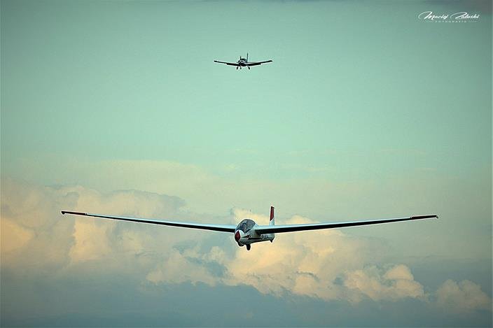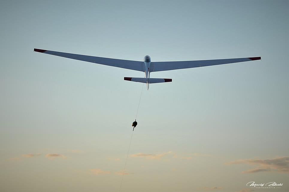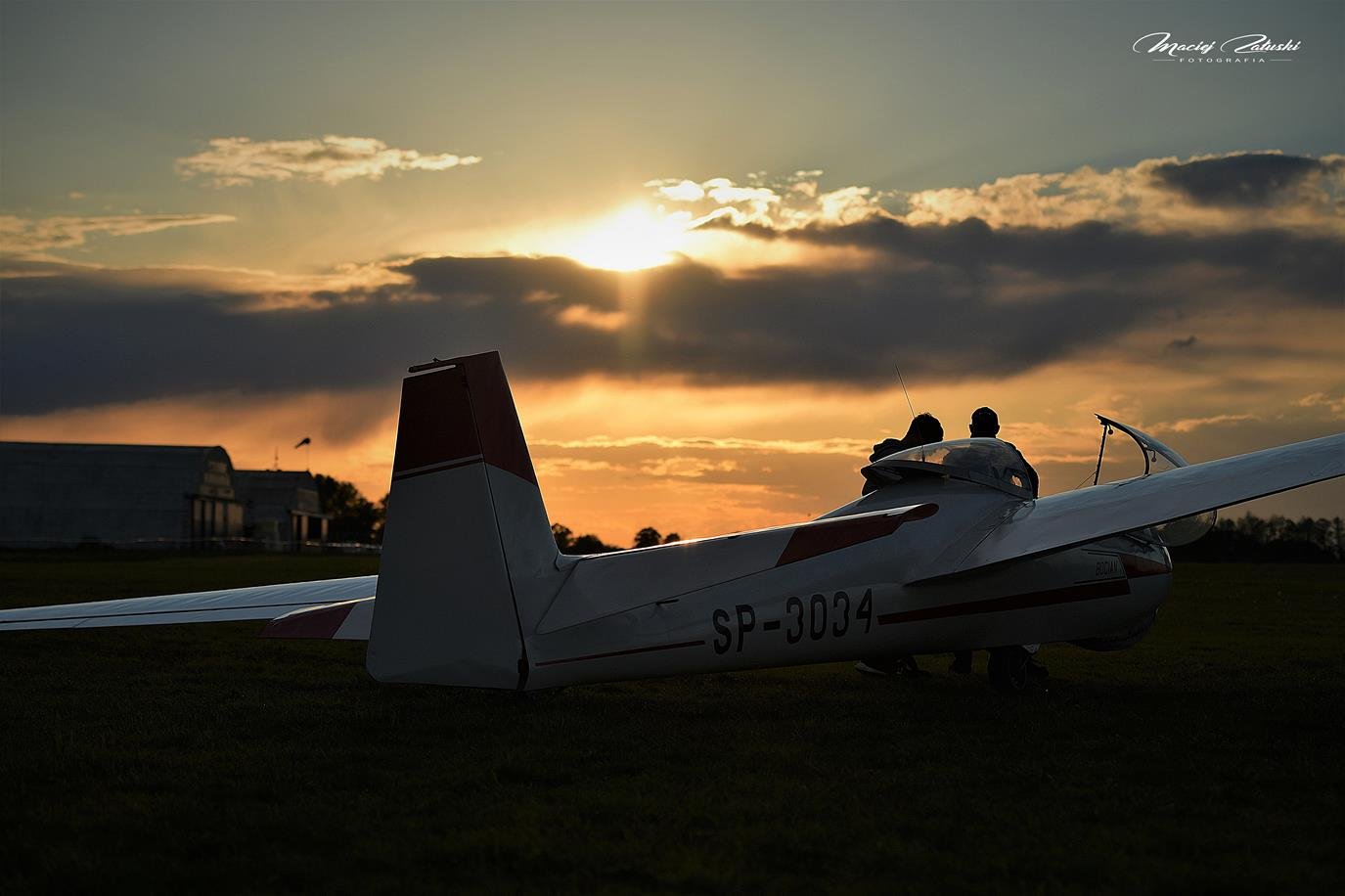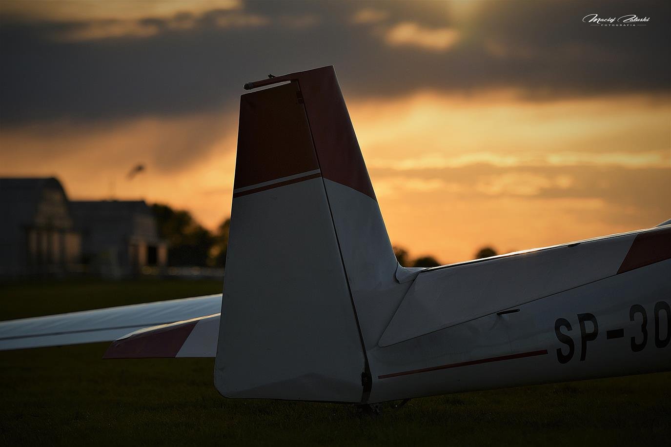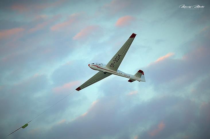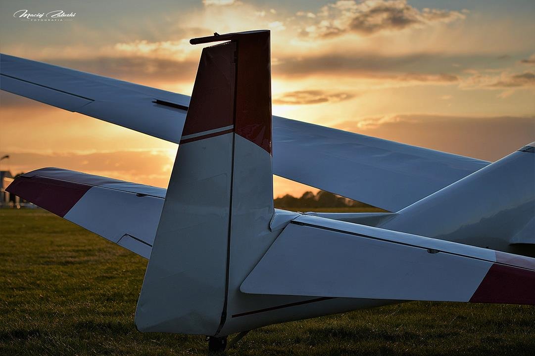 Lotnisko Szymanów, szybowce, samolot, zachód słońca.