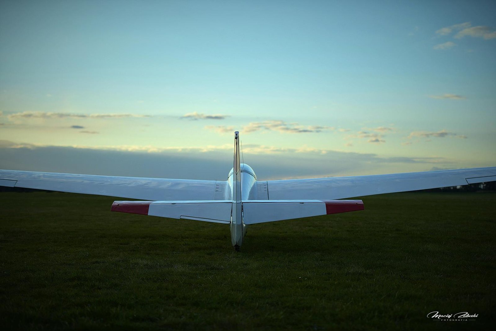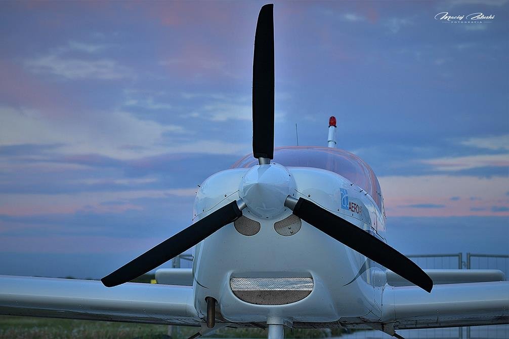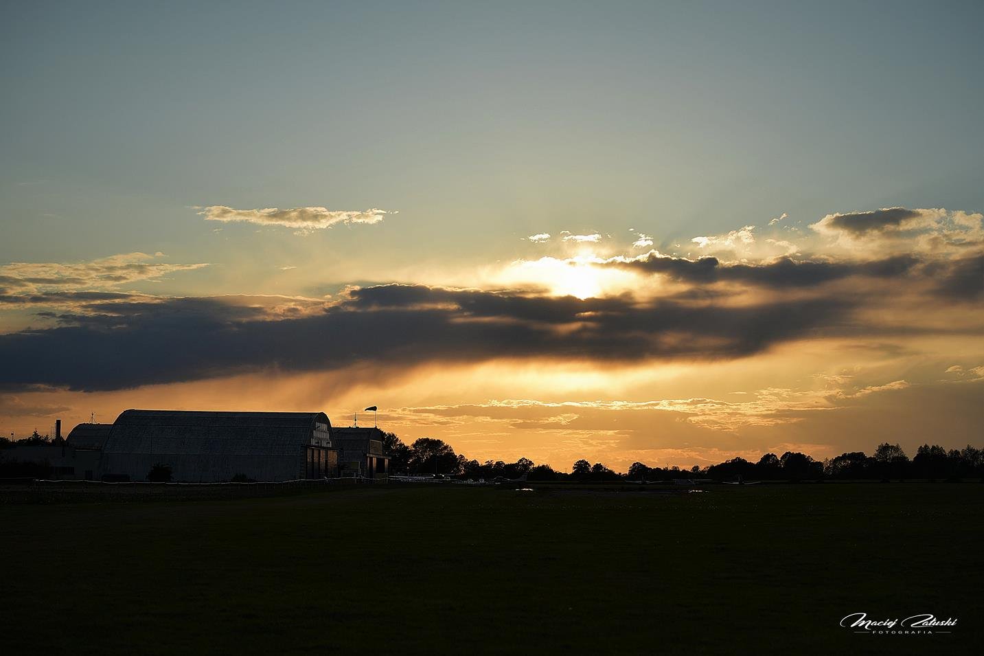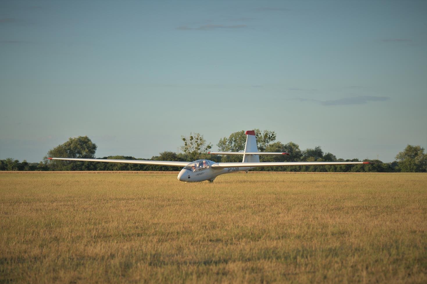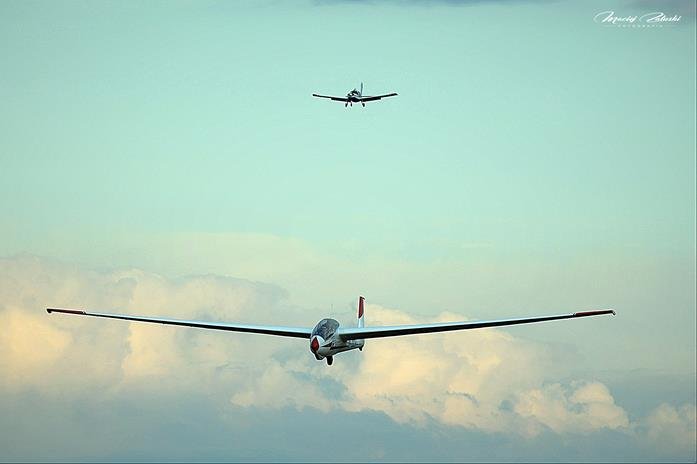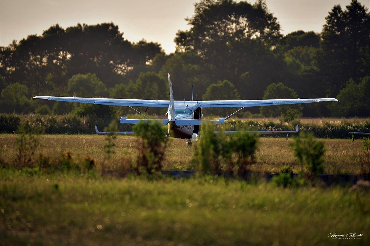 Lotnisko Szymanów, szybowce, samolot, zachód słońca.